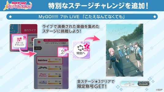 スマートフォン向けゲーム「バンドリ! ガールズバンドパーティ!」内、ステージチャレンジ「特別」に、本ライブで演奏された楽曲を集めたステージを追加しました。