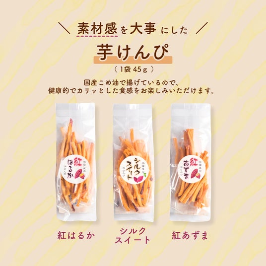 さつまいもの風味が広がるバリバリ食感の「芋けんぴ」、ねっとり濃厚で甘い「紅はるかの干し芋と焼き芋 」、素材の風味が広がる芋國屋の定番商品を詰め合わせました。紅茶やコーヒーなど好きなお飲み物と一緒に、冬ならではのくつろぎのひとときを、お楽しみいただけます。