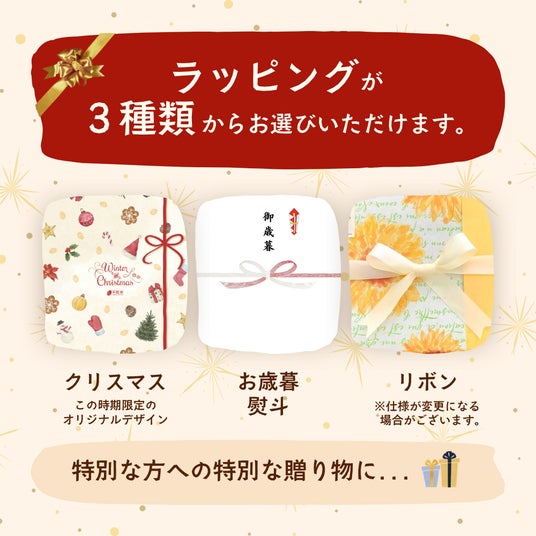 どちらの商品もギフトBOXに通常リボンラッピングまたは、クリスマス熨斗、お歳暮熨斗をお選びいただきお届けいたします。