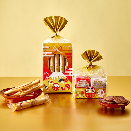 焼き上げた生地を二つ折りにして、ミルクチョコレートで包んだクッキー。パッケージはだるまをKEYに、松竹梅をあしらいました。個包装も紅白2種用意し、「開運」「招福」の文字とともにお正月のおめでたさを演出しています。