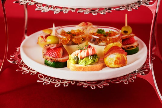 1段目と2段目には、苺のタルトやショートケーキ、苺と相性の良いプラリネやチーズのムースをご用意。また、ジンジャーエールのジュレやラズベリーのマカロンなど、さっぱりと味わえるスイーツも合わせてお楽しみいただけます。3段目のセイボリーでは、冷製キノコとコンソメのロワイヤルや合鴨と季節のフルーツのピンチョスなど、一口サイズで楽しめる、見た目も華やかな品々をご用意しました。