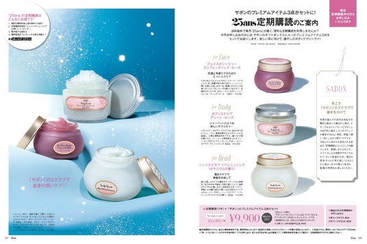 送料無料で毎月『25ans』が届く、便利な定期購読を利用しませんか?今お申し込みの方には、死海の塩などの自然由来成分を贅沢に配合した製品が人気のナチュラルコスメブランド「サボン」のスクラブ3点(ギフトボックス入り・15,400円)をセットでお届けします。乾燥しがちな冬こそスクラブによる全身の潤いケアが大切。毎日の美容タイムが待ち遠しくなるような心地よい花々の香りに包まれ、至福の時間をお楽しみください。定期購読(1年12冊)を新規でお申し込み、または現在定期購読中の方もお申し込みいただけます。