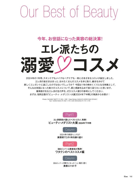 今回は1年の締めくくりとなる特集として、そんなお世話になった数々のコスメについて、愛と感謝を込めて振り返りたいと思います。審美眼が光るエレ派の生の声を、ぜひコスメ選びの参考にしてください。恒例企画の「ビューティ・メダリスト大賞2024年下半期」の発表もお見逃しなく。
