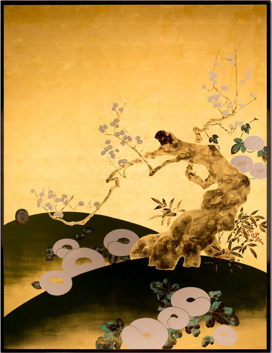 2015年3月の翠嵐 ラグジュアリーコレクションホテル 京都開業に合わせて、ガーデンテラススイート「玉兎」の襖絵「渡月四季花木図」を制作。箔を嵐山の象徴である月の明かりに見立てて、四季折々の草花、嵐山、保津川を描いた作品。伝統的な日本画の画材を用いて、コンテンポラリーなデザインを用いて嵐山を表現している。
