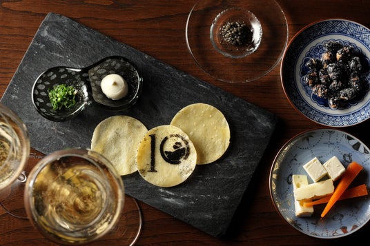シャンパンをはじめとするフリーフローのお飲み物のお供に「翠嵐オリジナルキャビアと10周年記念ロゴ入りガレット」をご提供