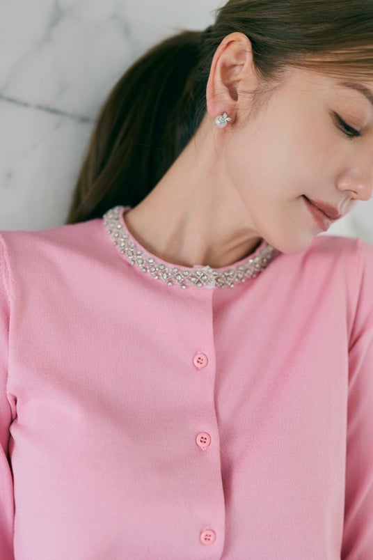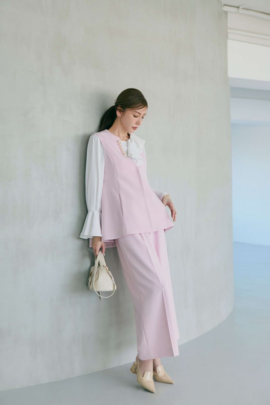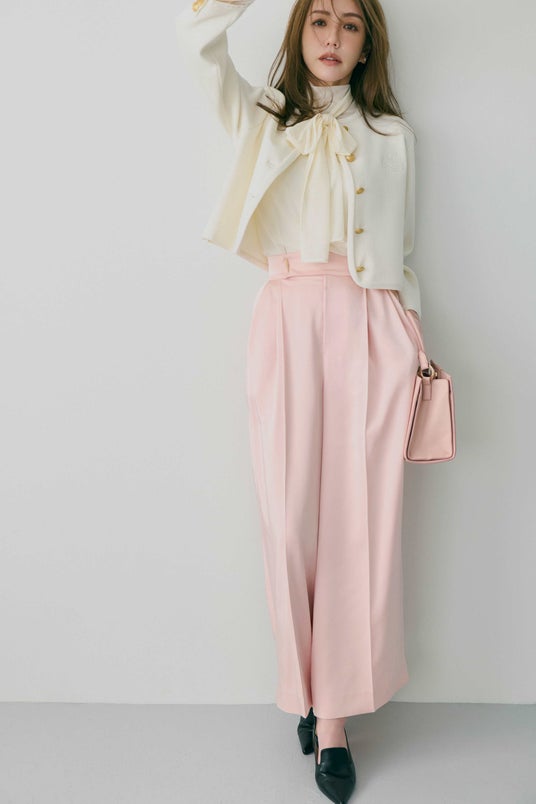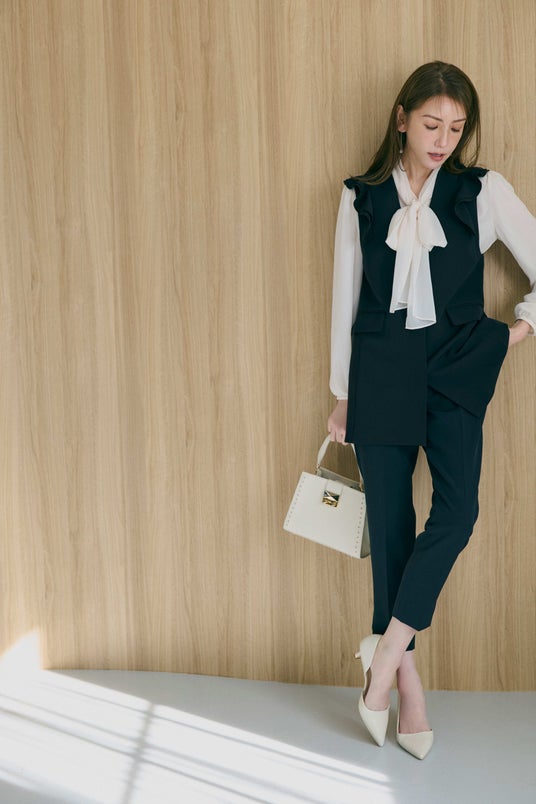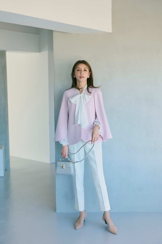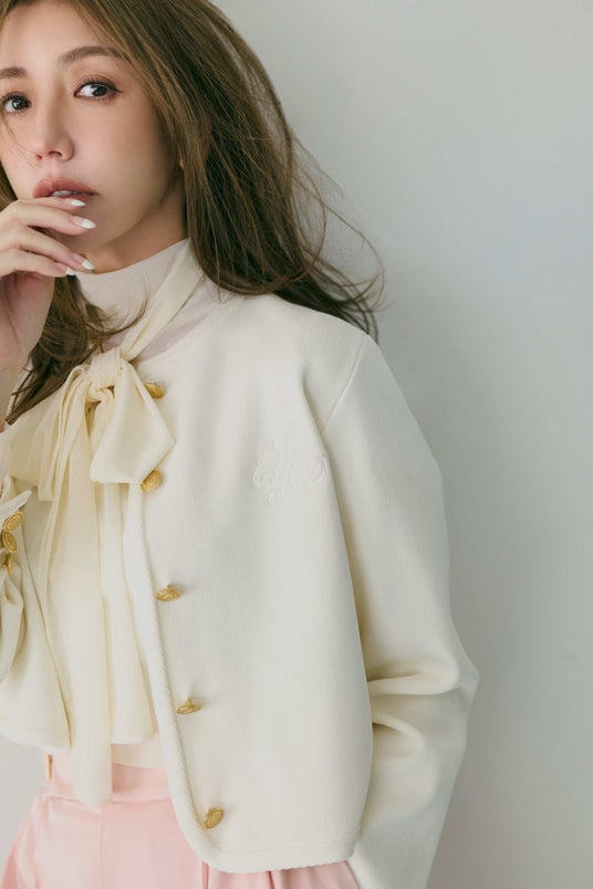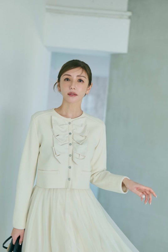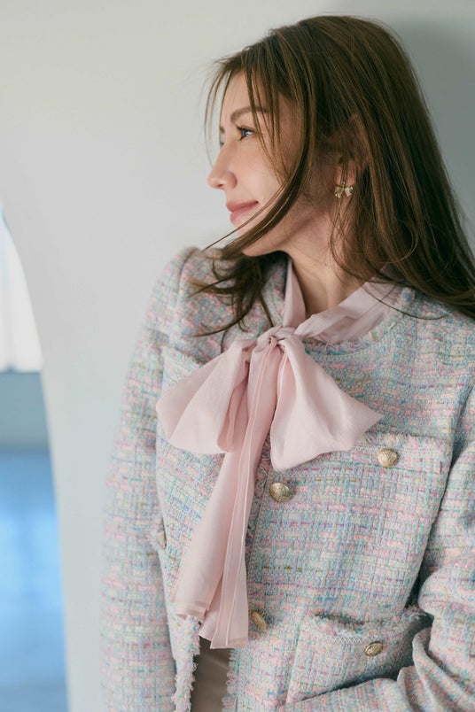 上品さを兼ね備えたジャケットからのぞくリボンと