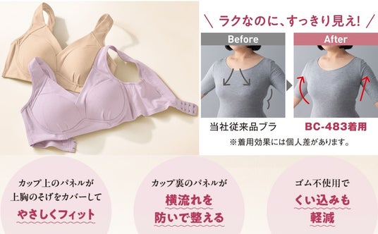 「だらしなく見えるのは嫌だけど、ブラを着けるのも苦しくなって・・・」そんなお客様のお声から、今のお客様にフィットするブラって?大人が本当に快適なブラとは?と考えたのがスタートです。気になる部分の締め付け感は軽減し、軽い着け心地でラクだけどすっきり見えるブラを目指しました。ゴムのくい込みが気になる前中心は、ゴムを使わない仕様にし、締め付け感を軽減しました。ラクで軽い着け心地になるように、カップも柔らかいモールドカップを採用。上胸のそげや横流れに対応するカップ裏や上辺部分のパネルで、ラクだけどすっきり見えるシルエットにもこだわりました。