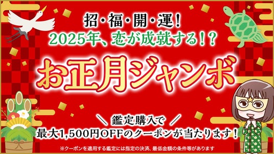 2025年1月3日(金)~1月31日(金)迄の期間限定で、新春特別キャンペーン「お正月ジャンボ」を開催いたします。今回の「お正月ジャンボ」では、あなたの恋愛に関する特別な占いパックをご提供します。さらに、占いをご利用いただいたお客様には、もれなく最大1,500円のクーポンをプレゼントいたします。