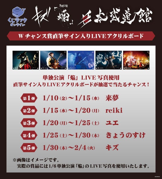 カルチュア・エンタテインメント株式会社は、ヴィジュアルロックバンド『キズ』とコラボレーションした、ハズレ無しでオリジナルグッズがゲットできるオンラインくじ「くじラックオンライン」を2025年1月10日(金)より販売いたします。賞品はA賞~E賞で、実際の賞品には単独公演 『焔』 2025.1.6 日本武道館 のLIVE当日に撮影した写真を使用します。さらに、くじ1枚ご購入ごとにWチャンス賞の抽選が行われ、当選した方は特別な賞品が獲得できます。