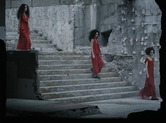 朱色と赤色が目を引くドレスは、着る者の身体を力強い彫刻のように見せ、破壊から始まる創造を締めくくる。