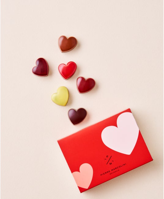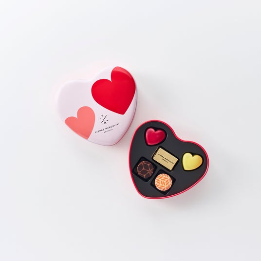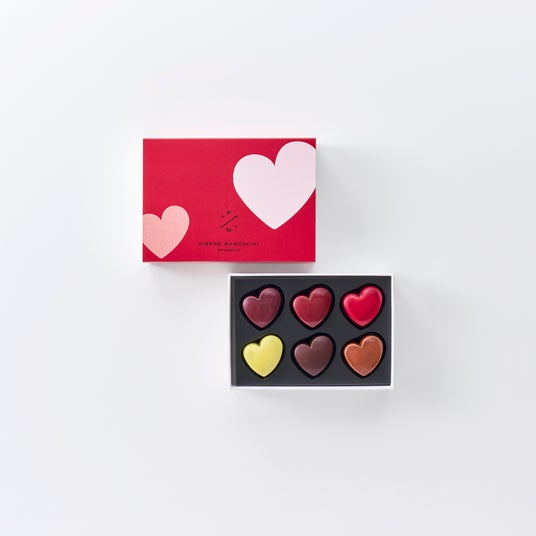 ブランドのアイコンであるクール シリーズを、30周年を記念してリニューアルした「クール ココロ シリーズ」。ピスタチオやサマートリュフ、ユズ、アプリコットなどの厳選素材を使用したバレンタイン限定フレーバー5種と人気のフランボワーズを詰め合わせました。アシンメトリーハートが華やかなハート尽くしのアソートメントです。