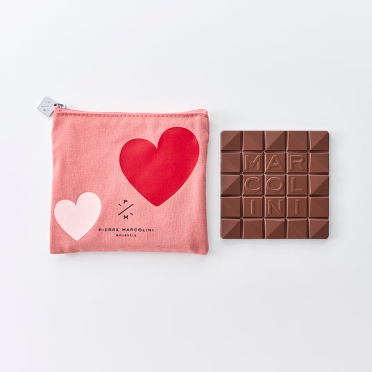 チョコレートの味わいをダイレクトに楽しめるタブレット ショコラを、アシンメトリーハートをあしらったバレンタイン限定ポーチとセットにしました。