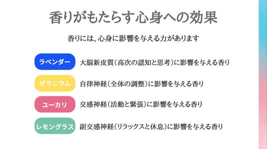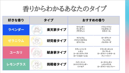 4種類の精油による「アロマチェック」から自身をひも解くと、今の自分の状態や必要なものが見えてくるため、参加者からは「まるで占いみたい」「どうして私のことがわかるの?」と言った声が挙がりました。