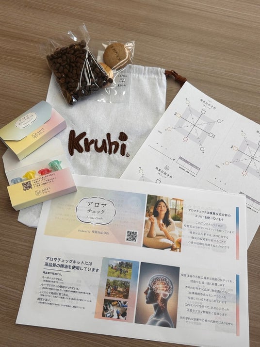 イベント参加者へのギフトは、自分との対話を深めてほしいという想いから、アロマチェックキット、Kruhiの本イベント用のクッキーとコーヒービーンズ。