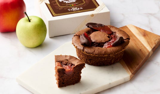 アムール・デュ・ショコラの企画による、パティシエを目指す専門学校生とのコラボレーションから生まれたスイーツ。シェフ田中千尋がアフリカのサントメ島の女性たちと一緒に作ったブラウニーのレシピを元に、学生たちと共に食材を選び、サントメと日本の架け橋となる新作ブラウニーが誕生しました。力強いカカオ感のサントメショコラと岩手県産りんご「紅の夢」、さらに米粉の生地の中には青リンゴ「ブラムリー」と「ジェネバ」のコンフィチュールを忍ばせたリッチな逸品です。