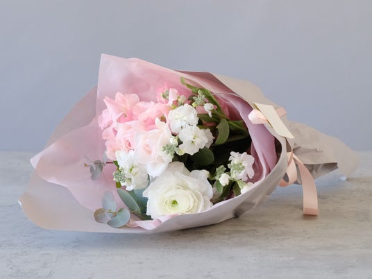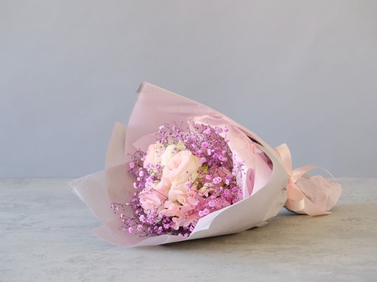 かわいらしいピンク色に染まったカスミソウは、今とっても人気の花です。やわらかな色合いのバラやスイートピーをふんわり優しく包み、春らしい花束にしました。