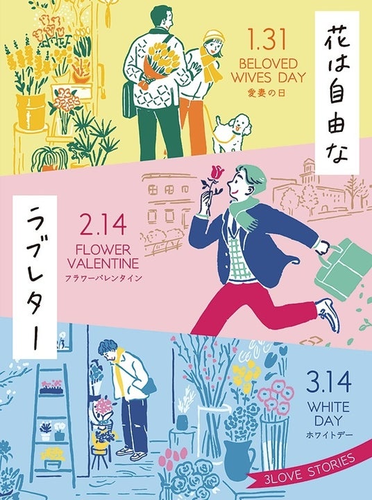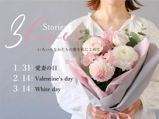 1月31日(金)の愛妻の日、2月14日(金)のバレンタインデー、3月14日(金)のホワイトデーの3つの記念日を「3 LOVE STORIES」として大切な人へ花を贈る文化を社会に浸透させるため、花き業界の企業や団体が参画する「花の国日本協議会」が中心となり行っているキャンペーンです。