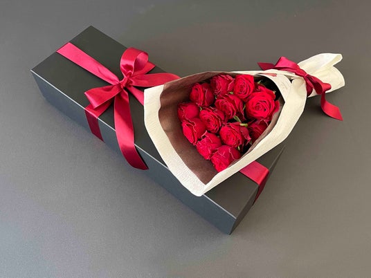 情熱的な赤いバラを12本束ねたブーケでお相手を驚かせましょう!
