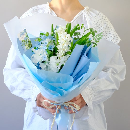 鮮やかなブルーのベールをまとったようなロマンティックなブーケ。