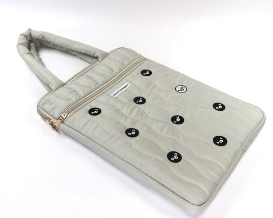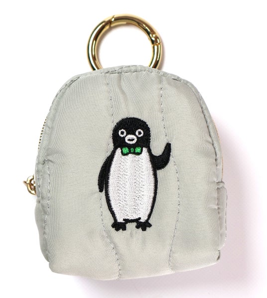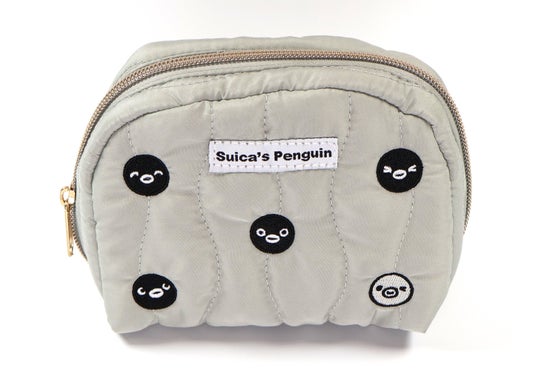 ライトグレーのふんわり柔らかいキルティング生地に、愛らしいSuicaのペンギンと子ペンギンの刺繍が施された、シンプルで可愛らしいデザインのグッズです。高級感のあるゴールドのファスナーや