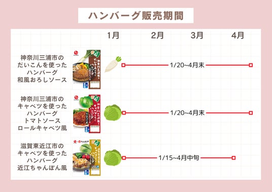 2025 年1月中旬より発売される『地域と旬』ハンバーグは神奈川県三浦市の特産品であるだいこんとキャベツを使用した『神奈川三浦市のだいこんを使ったハンバーグ 和風おろしソース』と、『神奈川三浦市のキャベツを使ったハンバーグ トマトソース ロールキャベツ風』、そして滋賀県東近江のキャベツを使用した『滋賀東近江市のキャベツを使ったハンバーグ 近江ちゃんぽん風』です。