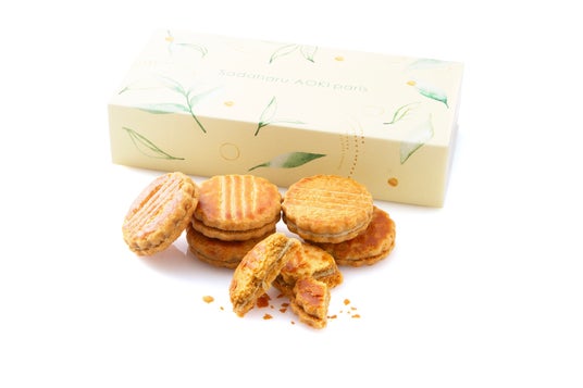 風光明媚な三重の山間部で、土づくりからこだわった亀山の赤色土で丹精込めて育てられた伊達丸亀製茶の亀山茶。今年も亀山茶の魅力を存分に引き出したお菓子をご用意いたしました。ざくざくとした食感とほろっと優しく崩れる生地が特徴の厚焼きサブレの間に、「おおきに上煎茶」と「べにほまれ紅茶」をそれぞれ使用したガナッシュをサンドし気品ある味わいに仕上げました。