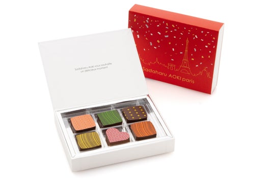 毎年「AOKI」の名を付けて発表している新作ショコラアソート。 「AOKI 2025」は、新作の「ジャンジャンブル」とフランスで最も権威あるショコラ品評会にて最高位の受賞歴を持つ「プラリネ オレ」 「パッション」と共に「ピスタッシュ」「オランジュ ラム」「キャ ラメル ノワ」を加えた計6粒を詰め合わせました。サダハルアオキ日本上陸20周年となる2025年を祝い、乾杯したくなるショコラのアペリティフをイメージしたスペシャルな一箱。ショコラのくちどけと共に広がるジンジャーやフルーツの香りと酸味、プラリネの芳醇な風味が優雅なひと時をもたらしてくれます。