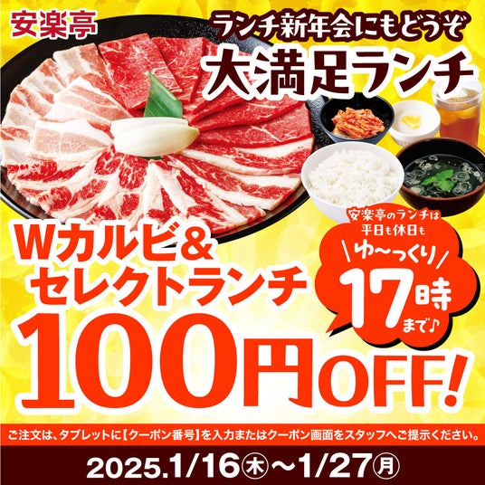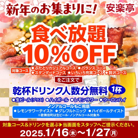 焼肉レストラン安楽亭(本社:埼玉県さいたま市、代表取締役:柳 先)は、2025年1月16日(木)~1月27日(月)の期間 お肉で新年会!食べ放題&満足ランチ「新年会キャンペーン」を実施します。