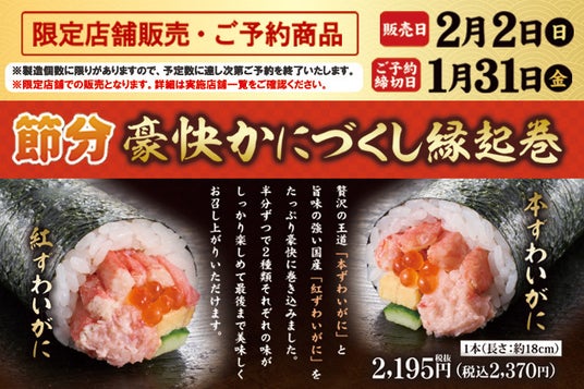 【ご予約承り中!】2月2日(日)は節分!今年の恵方は「西南西」!小僧寿しでは、限定店舗販売・ご予約商品『豪快かにづくし縁起巻』をご用意しました!