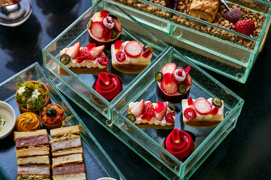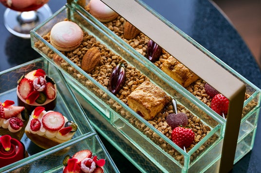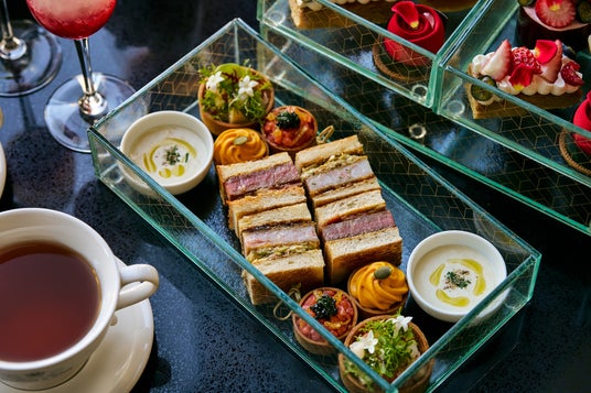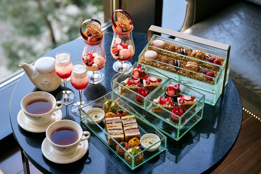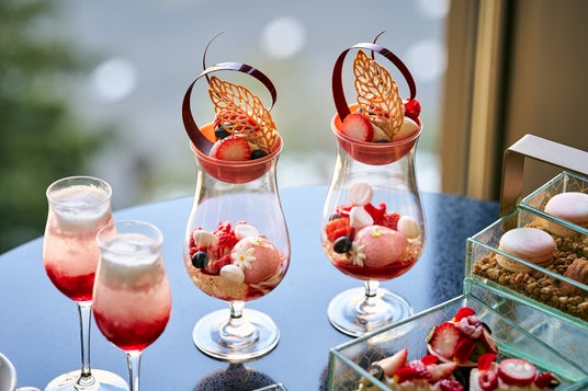 煌めく宝石のようなスイーツは一粒一粒が輝きを放ち、どれから手に取るか迷ってしまうほど魅力あふれるスイーツに仕上がっております。いちごをテーマにした4種類のミニケーキは、深紅の装いが美しく、いちごの豊かな風味が堪能できるこだわりの詰まった味わいです。セイボリーには豪華なローストビーフサンドをご用意。ジューシーな味わいの分厚いローストビーフが特別感を演出します。いちごスイーツや、フレッシュないちごを贅沢に詰め込んだパフェも登場。色鮮やかに盛り付けられたパフェにソースを上から注ぐ趣向を凝らした演出で、視覚的にも味覚的にも楽しめる逸品です。