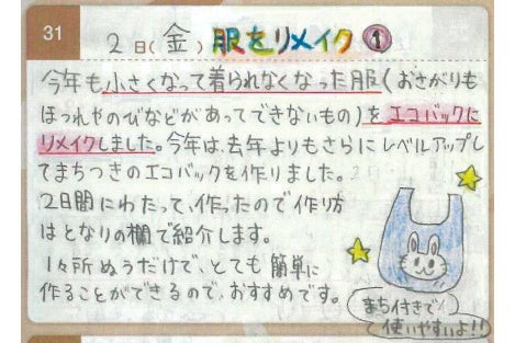 環境日記を通じて色々なリメイクに挑戦しました。例えば、お気に入りのTシャツが着られなくなったので、ずっと使えるようにクッションにリメイクしました。リメイクには、おばあちゃんと一緒に取り組みました。ポイントは、水着をエコバッグにリメイクした際に残ったリボンをクッションのワンポイントに使ったところです。他には、お気に入りのタオルがもう使えなくなったので、タオルのピンク色をいかして、うさぎのぬいぐるみにリメイクしました。