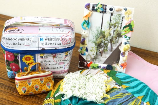 左上が100点のテストをアップサイクルしたポーチ