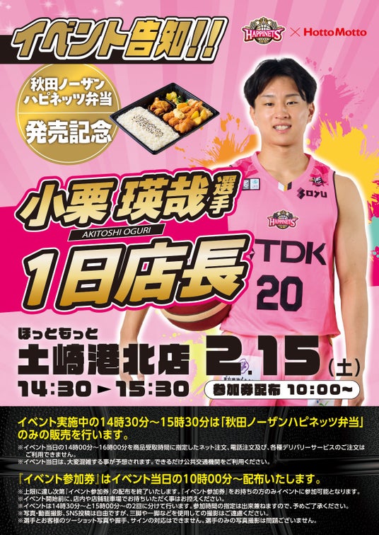 『秋田ノーザンハピネッツ弁当』の販売を記念し、「秋田ノーザンハピネッツ」の小栗瑛哉選手が「ほっともっと」土崎港北店の店舗にて1日店長を務めます。イベントでは、普段は見ることが出来ない「ほっともっと」の制服を着た小栗瑛哉選手が店頭で『秋田ノーザンハピネッツ弁当』を提供してくれます。