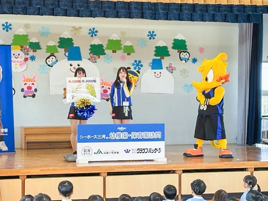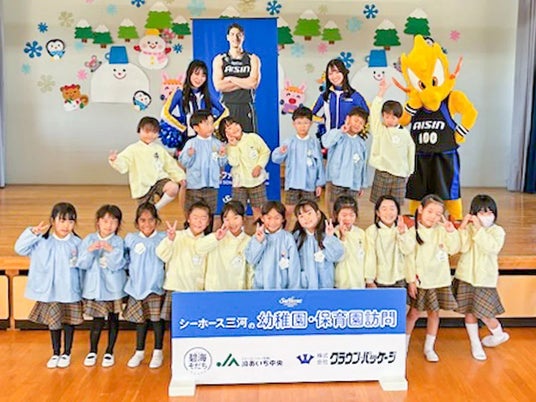 2024年12月3日(火)、シーホースくんとSuper GirlsのCHINA、YUKIがやはぎみやこ認定こども園(岡崎市)を訪問し、園児の皆さんと一緒にクイズやダンスを楽しみました。