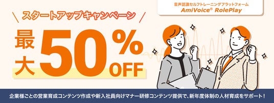 株式会社アドバンスト・メディア(本社:東京都豊島区、代表取締役会長兼社長:鈴木清幸 以下、アドバンスト・メディア)は、AIを活用したセルフトレーニングプラットフォーム「AmiVoice RolePlay (アミボイス ロールプレイ)」を、最大50%OFFでお得にご利用いただけるスタートアップキャンペーンを開催いたします。
