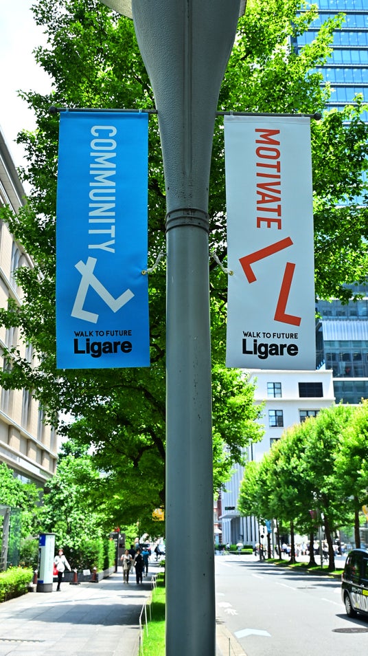 「Ligaretta」の展開するプロダクトは、丸の内仲通りに掲出されたバナーフラッグを主な素材とし、権利や知財の壁を克服するために施された「シークレット地紋」により、廃棄されるはずだったものや活用することが難しかった街路灯バナーフラッグ広告を余すところなくアップサイクルしています。