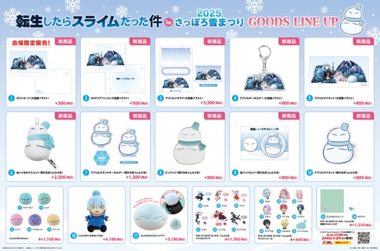 2025さっぽろ雪まつり会場にて、『転生したらスライムだった件』新商品を含むオリジナルグッズの販売を行います。大雪像のイラストを使用した新商品は、ポストカード(会場限定販売商品)、A4クリアファイル、アクリルジオラマ、アクリルキーホルダー、アクリルマグネットの5アイテム、雪だるまになったリムルのイラストを使用した新商品は、ぬいぐるみマスコット、アクスタキーホルダー、ピンバッジ、缶バッジセット、アクリルマグネットの5アイテムです。その他、既発売のオリジナルグッズも販売いたします。