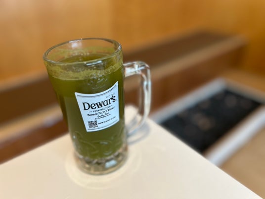 アイスモリンガ茶(ラドン水使用) 450円:足石湯スペースでご提供するモリンガ茶(ホット・アイス)とホットコーヒーにはラドン水を使用しています。