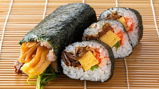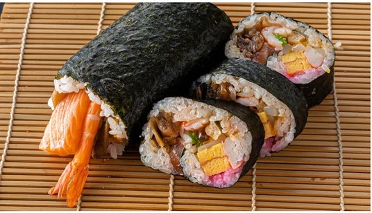 「大津」プレミアム巻き(ハーフ) 税込1,200円 (玉子・エビ・サーモン・穴子・干瓢・椎茸・おぼろ・花咲イカ・カニカマ・イクラ)