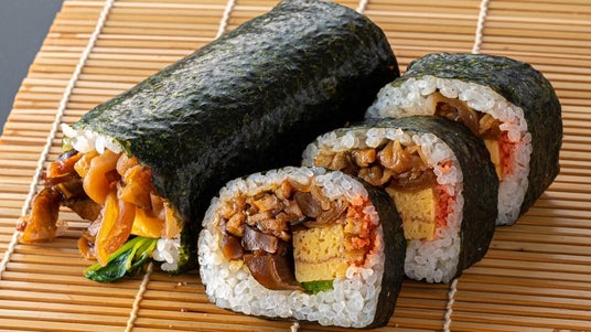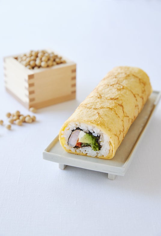 海老・アボカド・クリームチーズなどを、甘みのある薄焼き玉子で包んだ毎年好評の一品。野菜や人参ナムルの食感もアクセントに。