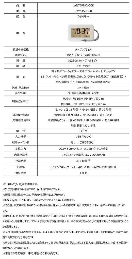液晶画面は3段階の明るさが調節でき、昼夜を問わず時刻が見やすいため、寝室などで活躍します。目覚まし機能付きで、アラーム音とともにランタンが強点灯で灯り起きる時間をお知らせします。