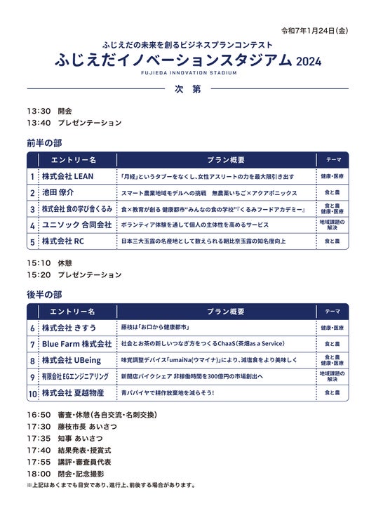 「食と農」「健康・医療」の活用や地域課題の解決(イノベーション)をテーマに、藤枝市をフィールドとした、新製品や新サービスに関するビジネスプランコンテスト「ふじえだイノベーションスタジアム2024」の最終審査会(プレゼン審査)を開催します。