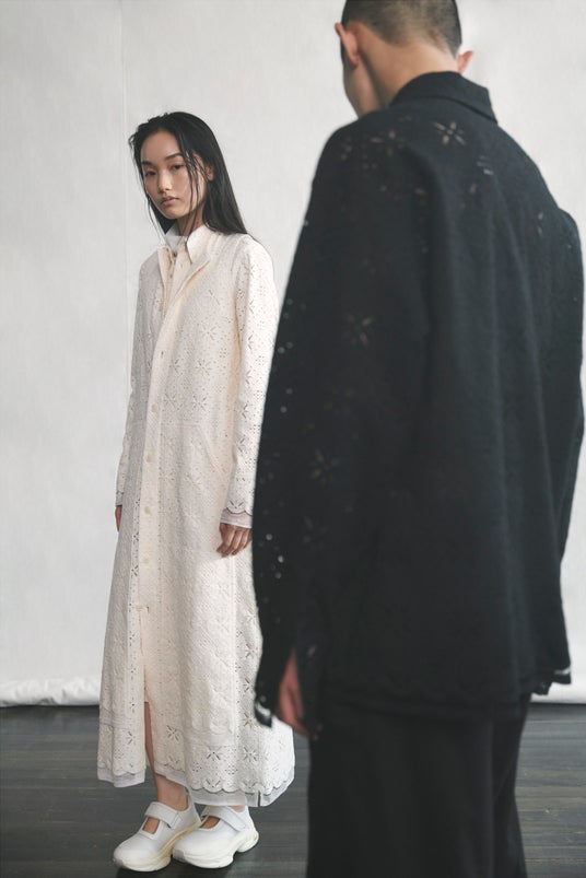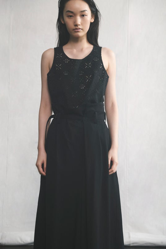 袖なしの前開きドレスに細身のロングシャツを重ねた白のスタイルと、胸ポケット付きのシャツにドローストリングパンツを合わせた黒のスタイル。コットンレースの印象がつくる、ヘルシーなレイヤードスタイル。