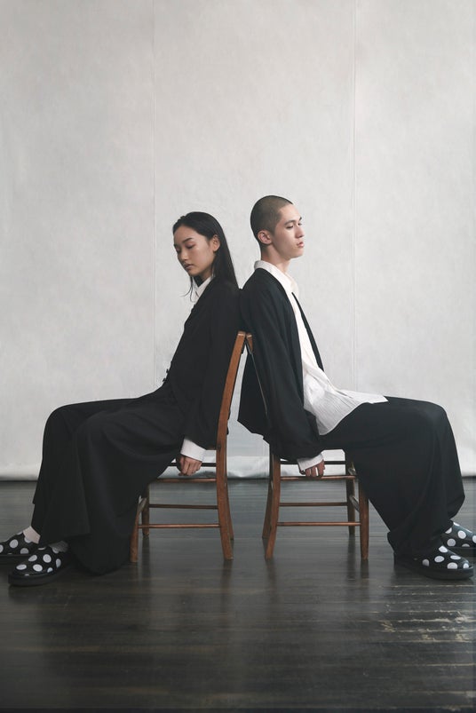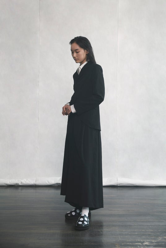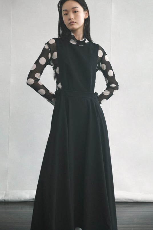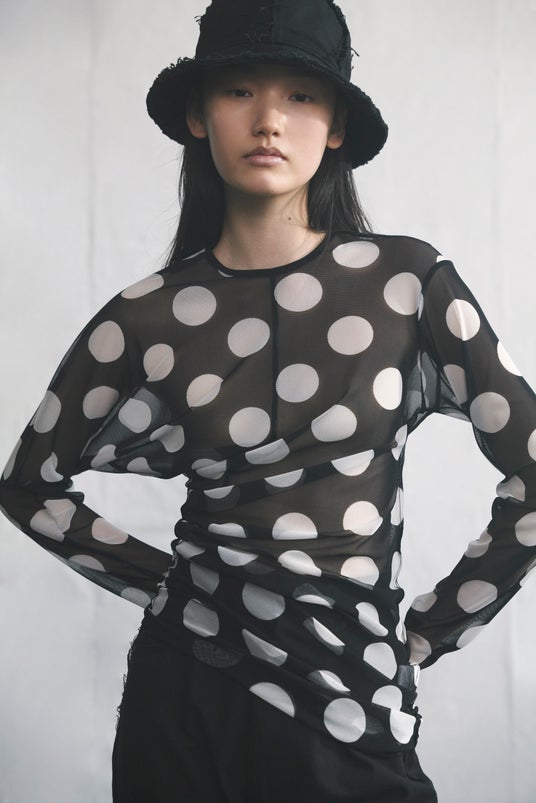 ワイズらしい造形と、レースやボーダー、ドットなど確立された様式や柄、黒と白の色構成など不変の要素を服に纏め、素直に表現する──ニュートラルな印象とディテールのつくり込みが共存する「Y's....」。削ぎ落とされたフォルムに、独特の存在感を持つシルエット。