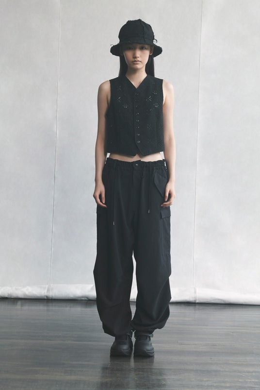 コットンレースの一重仕立てのノーカラーベスト。ドローストリングパンツ。