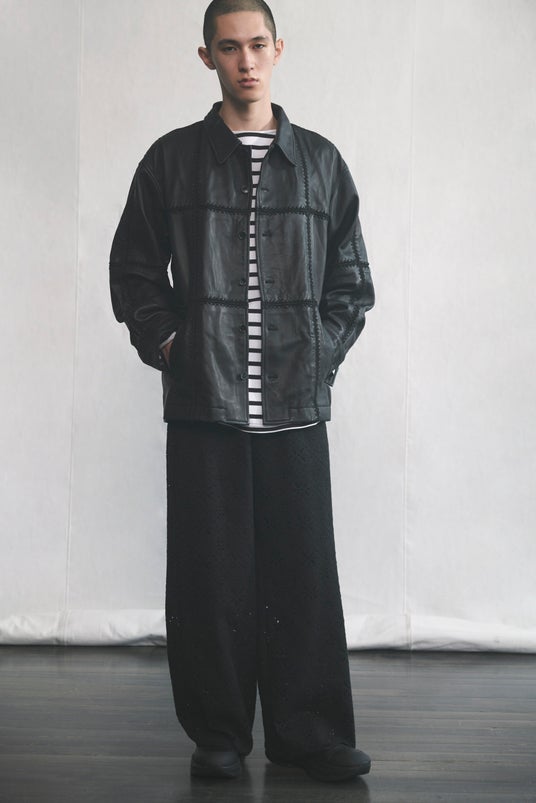 総裏仕立て、インドで手刺繍がされたレザージャケット。コットンレースのパンツ。