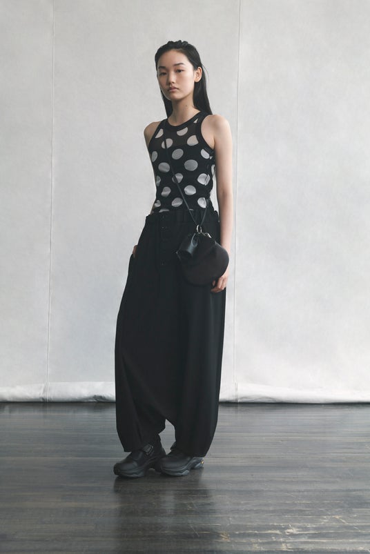 分量感のあるサルエルパンツ、水玉模様が印象的なチュールノースリーブトップス。