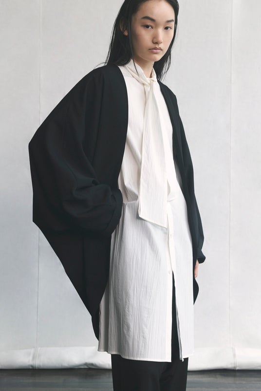ボウタイビッグシャツにドルマンロングジャケットを羽織った、柔らかなジャケットスタイル。