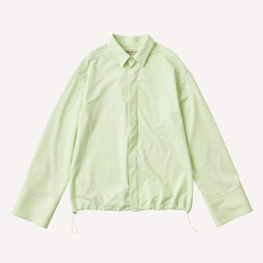 デンマークで大切にされている居心地のいい空間を意味する"Hygge(ヒュッゲ)"の解釈を拡げ、年齢や性別、シーンなど、様々なボーダーを超えて、心地よく着用可能なシャツ。特殊なジャージ素材を採用し、軽くリラックスした着心地とシワになりにくさを実現。裾のドローコードを調整することでシルエットの変更が可能。