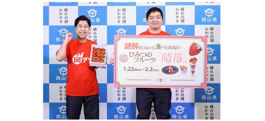 岡山県はこの度、晴苺を使用したスイーツフェア「謎解きしないと食べられない ひみつのフルーツ『晴苺』」を東京・新橋にあるアンテナショップ「とっとり・おかやま新橋館」2階レストラン「ももてなし家」にて2025年1月22日(水)~2月2日(日)の期間で提供します。それに伴い、1月21日(火)に記者発表会を実施。コンビ揃って岡山県出身であるウエストランドのお二人がゲストとして登壇し、「晴苺」の魅力をPRしました。